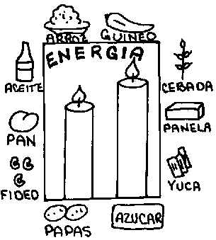 Una casa también necesita energía, ¿ no? Tenemos un foco o una esperma para darnos luz. Un fuego da calor y energía para cocinar. Así mismo, nuestros cuerpos necesitan energía. Hay un grupo de alimentos que sirve específicamente para darnos energía - como el fuego y la luz da energía a la casa. Estos son "los alimentos que nos dan fuerza " (Ahora haga una lista de los alimentos en este grupo)