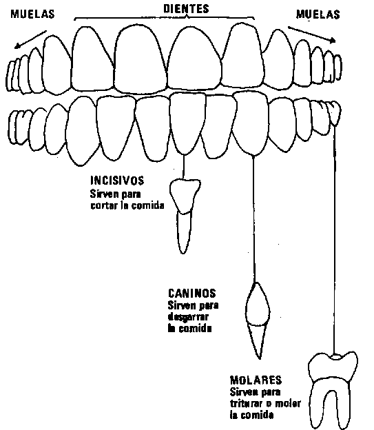 Se puede observar que todos los dientes no son iguales. Tenemos dientes de varias formas para permitirnos comer diferentes clases de comida. Los diferentes tipos de dientes tienen distintas funciones en la masticación.