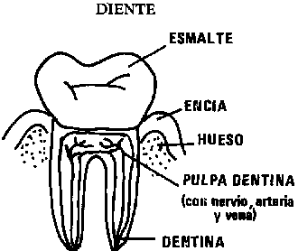 Los dientes y las muelas son partes vivas del cuerpo humano. Adentro de la raíz de cada diente, hay una arteria y un nervio. La arteria trae sangre para alimentar el diente. El nervio viene del cerebro y lleva la sensación del dolor. Cuando la caries destruye el esmalte y la dentina del diente al llegar al nervio, causa dolor.