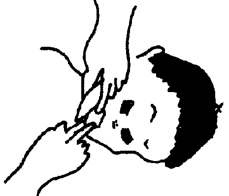 c. Ciérrele las narices con sus dedos. Abrale bien la boca, tápela con la suya y sople con fuerza para inflar los pulmones. Deje que salga el aire y vuelva a soplar. Repita esto más o menos 15 veces por minuto en un adulto. En un niño de edad es colar, sople 20 veces por minuto. En recién nacidos, sople 25 veces por minuto (con poca fuerza).