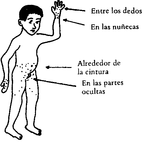 Escabiosis (Rascabanito): La escabiosis es una enfermedad muy contagiosa y muy común en los niños. Es causada por pequeños animalitos que hacen túneles debajo de la piel. Se transmite por contacto directo o por la ropa personal. Síntomas: Produce granitos con mucha comezón especialmente en la noche. Los granitos aparecen principalmente en los siguientes sitios: