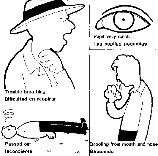 Si Ud. no puede respirar bien, está babeando por la boca y la nariz, las pupilas en el medio de los ojos se ponen muy pequeñas y Ud. se desmaya, éstos son síntomas que pueden causar la muerte. Si Ud. ve a alguna persona con estos síntomas busque ayuda médica inmediatamente, ya sea en la oficina de un médico o el salón de emergencia en el hospital.