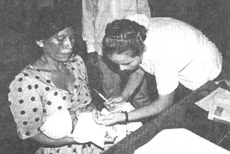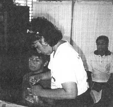 SANICHA GLORIA MURAYARI SACANDO GOTA GRUESA A PACIENTE DURANTE LA SUPERVISIÓN QUE REALIZARON AL PUESTO DE SALUD DE SAPUENA, LA ENFERMERA ELDA ZAMORA DEL C.S. REQUENA MIRA ATENTAMENTE.
