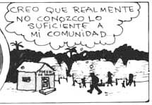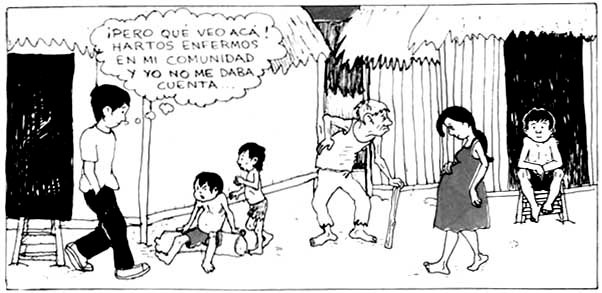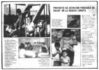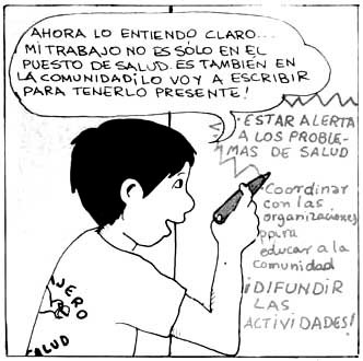 AFICHE diseñado durante el III Taller para Técnicos capacitadores-supervisores por los participantes. En este afiche podemos observar el mapa de nuestra extensa región y la ubicación de los Centros de Salud, así como el lema: "SALUD Y COMUNIDAD: TRABAJANDO JUNTOS PARA DEFENDER NUESTRA VIDA". También vemos el dibujo de un sanitario rodeado por su comunidad como muestra de nuestro deseo por trabajar y servir de cerca y coordinadamente con la comunidad.