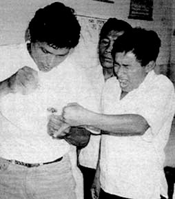 TAE Jorge García recibiendo pinchazo de parte de su compañero Fernando Velásquez en demostración de como sacar muestra de Gota Gruesa.