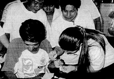 Durante los Talleres de capacitación los sanichos demostraron con sus compañeros, su gran habilidad para la toma de gota gruesa como parte del tema de Malaria.