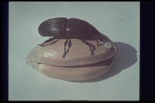 Close-up of female Sitophilus laying egg on wheat