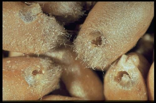 Close-up of Sitotroga damage on wheat seeds