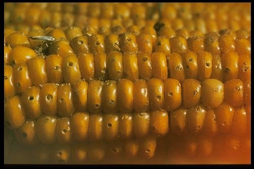 Close-up of Sitotroga damage on maize seeds
