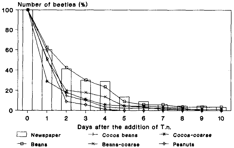 The beetles left more quickly than the newspaper. There were more beetles left only on maize, sorghum, coffee beans and coarsely ground coffee beams. On the third day, the proportion of T. nigrescens found on the substrates had, however, also fallen to a level comparable to the control. The products evidently had no special attraction for the beetles. In total, an average of 82% of T. nigrescens had left after 3 days, and after 5 days, this already amounted to 93%. No tendency could be observed for a larger number of adult T. nigrescens to remain on any of the substrates for a longer period of time.
