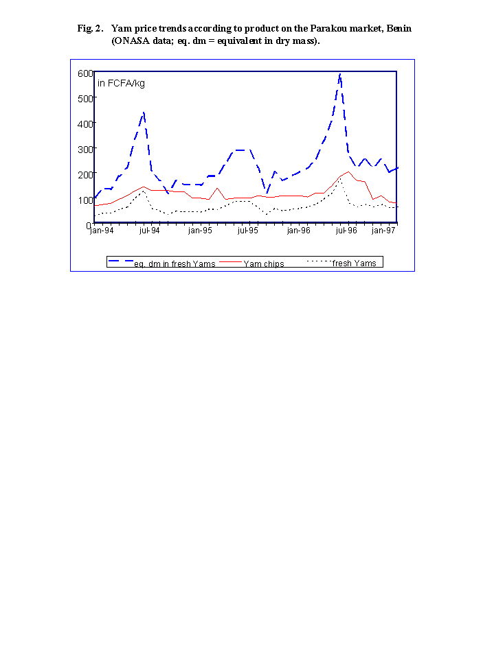 Since the devaluation of the CFA franc, yam chips in Benin have settled at a price ranging between that of cassava or maize and of rice, wheat or fresh yam (see Tab. 1 and 2). |