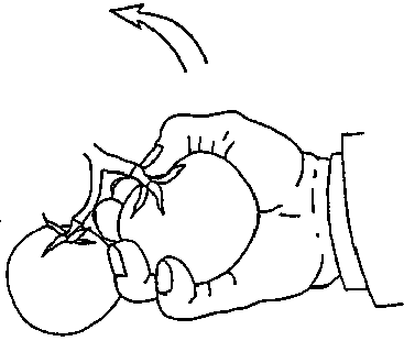 For some crops, a natural break point forms at the junction of the stem and the stalk when produce is mature. Harvesters should grasp the product firmly but gently and pull upward as illustrated below. Wearing cotton gloves, trimming fingernails, and removing jewelry such as rings and bracelets can help reduce mechanical damage during harvest.