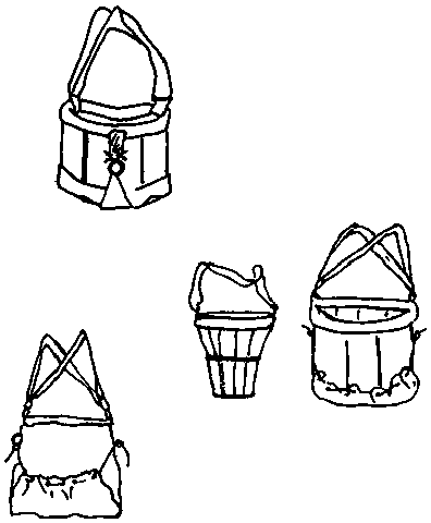 Picking baskets, bags and buckets come in many sues and shapes. These harvesting containers can be made by sewing bags with openings on both ends, fitting fabric over the open bottom of ready-made baskets, fitting bags with adjustable harnesses, or by simply adding some carrying straps to a small basket. Several examples are illustrated below.
