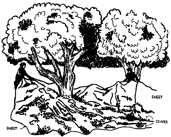 Unlike most nut crops, pistachio nuts should not be knocked to the ground during harvest because of their open shells and relatively high moisture content. The harvesting practice illustrated below can be used with pistachios and olives with good results. Plastic sheeting or canvas tarpaulins are spread below the tree being harvested, and trees are mechanically shaken or hand knocked (the branches hit with mauls) until the nuts drop. In the illustration below, two harvesters are gathering a sheet covered with produce.