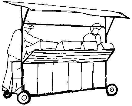 A simple aid for field packers is a movable cart with a rack for boxes and a roof to provide shade. This cart is designed to be pushed along the outer edge of the small field where harvest is taking place.