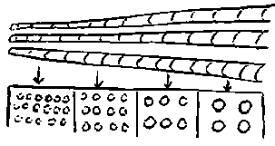 The rotary cylinder sizer illustrated below is composed of five hollow cylinders which rotate in a counterclockwise motion when driven by an electric motor. Each cylinder is perforated, with holes large enough to let fruits drop through. The first cylinder has the smallest diameter holes, and the fifth has the largest holes. When fruits fall through, they are caught on a slanted tray (the chute), and roll into the containers as shown. Take care that the distance of the drop is as short as possible to prevent bruising. Oversized fruits are accumulated at the end of the line. This equipment works best with round commodities.