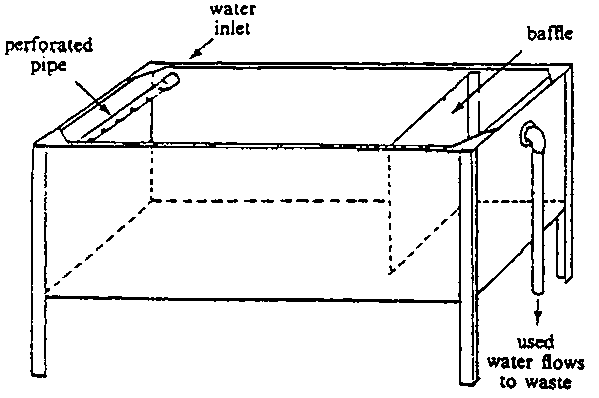 This tank for washing produce is made from galvanized sheet metal. A baffle made of perforated sheet metal is positioned near the drain pipe and helps to circulate water through the produce. Fresh water is added under pressure through a perforated pipe, which helps move floating produce toward the drain end of the tank for removal after cleaning.