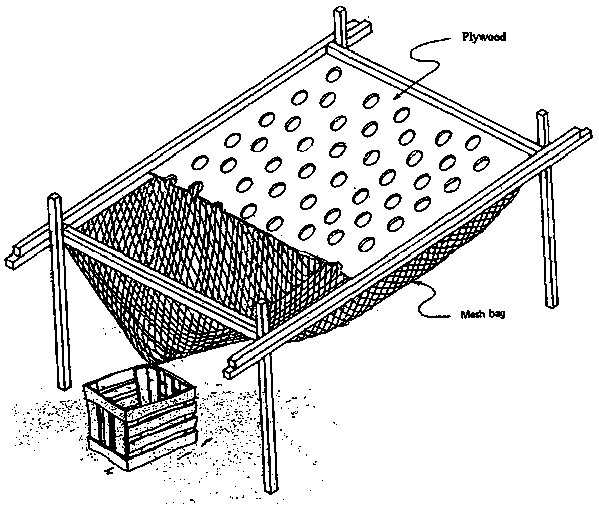 The onion sizing table illustrated below is one of three (or more) tables used in a stairway fashion. Each table is made of plywood, and has been perforated with holes of a specific size. The uppermost table has the largest size holes, and the lowest table has the smallest holes. A layer of onions is dumped onto the uppermost table. Those that do not pass through are classified as "extra-large'' in size. Those that pass through fall into a mesh bag and roll into a large container. This container of onions is dumped onto the second sizing table. The onions that do not pass through are classified as "large", and so on.