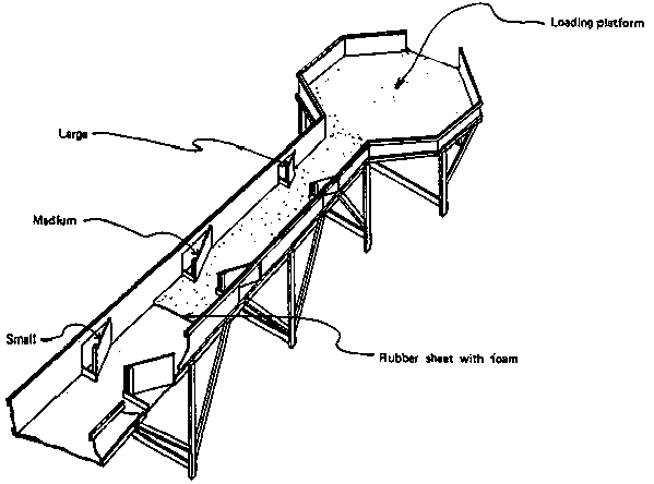 The pommelo sizer illustrated below is composed of a rectangular chute made of plywood, padded with foam to prevent bruising. The fruit is dumped into the octagonal platform at the top of the chute, then allowed to roll, one by one, down toward a series of constrictions. Large fruits are caught in the first constriction, medium in the second, and small in the last. Undersized fruit passes out the end of the chute directly into a container. Workers must manually remove each fruit and place it into the appropriate size container before the next fruit can pass through the chute. The sizing is fastest when five workers are stationed at the sizer.