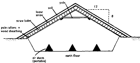 For large quantities of potatoes, a self-supporting A-frame storehouse can be constructed. A pit is dug about 10 feet deep and wooden air ducts are placed along the earthen floor. The roof of the building is constructed of wood, then covered with straw and soil.