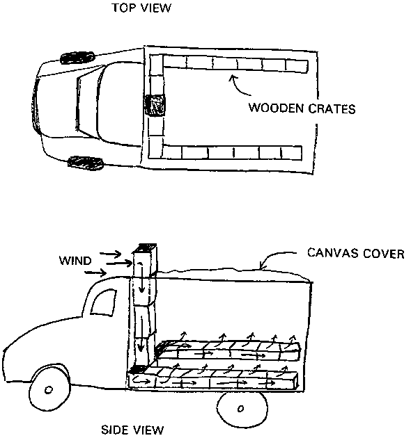 This ventilating system was designed for hauling bulk loads of fresh fava beans in Iran. The wind catcher and ducts were constructed using wooden crates. After removing their end panels the crates were wired together into the pattern shown below. Air flows upward through the load during transport, helping to keep the produce from overheating. This system has also been used in pick-up trucks, and for hauling bulk greens and green beans. Best results are obtained when transporting during the early morning hours, before sunrise.
