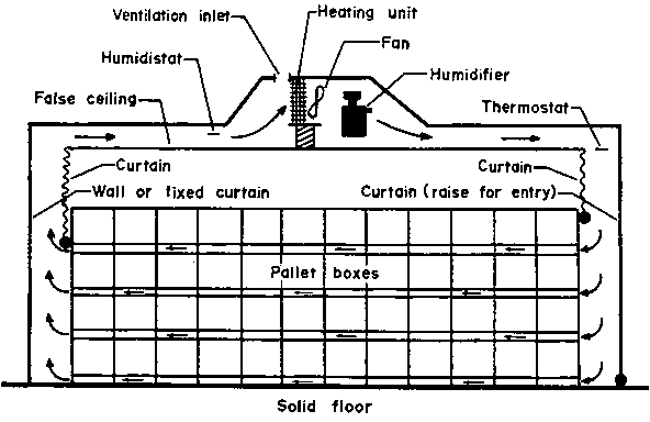 The following illustration is a degreening room designed for use with citrus in pallet boxes. The ceiling of the room is relatively high, allowing boxes to be stacked at least four high. A false ceiling is added to provide for adequate air movement throughout the room. For more detailed information on room construction, temperature and relative humidity management and air circulation, refer to the article entitled "Ripening Facilities" (Thompson, 1994) in the reference section of the manual.