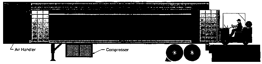 Small-scale handlers can now lease portable ripening facilities from a variety of companies in the United States. The self-contained, portable system illustrated below features a 20 pallet capacity, high capacity air flow and is simple to operate. All that is needed is a loading dock and a supply of 220V electricity.