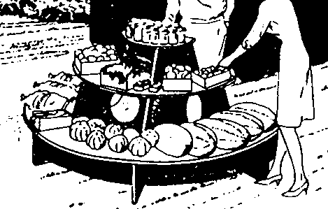 A simple semi-circular display table can be constructed from one four foot by eight foot sheet of plywood. Plans for the table illustrated below and for other market stands are available from Cornell University Extension, 304 Riley-Robb Hall, Ithaca, New York 14853.