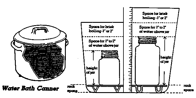 Two types of canners are commonly used to process horticultural crops. The first is a water bath canner, which is a large pot with a loose cover and a rack to hold jars off the bottom The pot should be deep enough to cover the canning jars by one to two inches and still have another inch of space to allow brisk boiling. The diameter of the pot should be no more than four inches wider than the diameter of the stove's burner to ensure even heating.