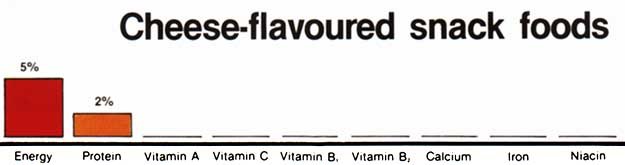 The bar graphs show the food values of two foods that can be bought for the same price. Bananas have other nutrients in addition to energy and protein. Cheese-flavoured snack foods that are sold in brightly coloured packets have none of these important vitamins and minerals. Bananas are the better buy because they have more food value for the money spent.