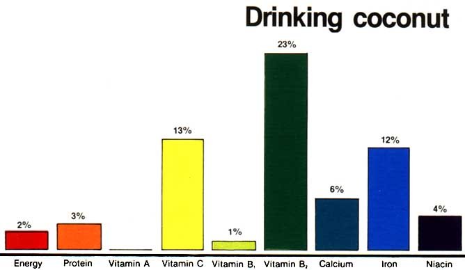 Coconuts are both an energy food and a protective food. The mature coconut is an energy food because it contains a lot of fat. Coconut toddy (see section on coconut foods) and green nuts are health or protective foods because they contain large amounts of some vitamins and minerals that are necessary for good health.
