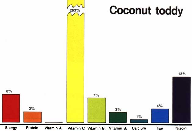 Vitamin C keeps the body tissues strong, helps the body use iron, and aids in chemical actions in the body. Fresh coconut toddy is high in Vitamin C. Green coconut water, the germinating coconut, and the heart of the coconut palm also have a fair amount of Vitamin C.