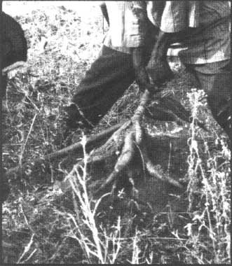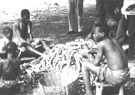 The cassava plant (Manihot esculenta Crantz) is a perennial shrub, ranging in height from one to five meters, with branching stems, green, pale or dark grey or brown in colour. The root crop is an ideal subsistence crop for the tropical world because it is well adapted to marginal soils, has the ability to tolerate environmental stress, gives relatively high yields compared to other staple crops, is an excellent source of carbohydrate and can be kept underground from 6 - 36 months after planting and is thus always available to the farmer. Cassava leaves contain about 7 -12% protein and are used as a vegetable in traditional soups and stews. The root itself is rich in carbohydrates (32%), vitamin C and calcium but poor in protein and other vitamins and minerals. Cassava roots are different from yams because they are not dormant organs and thus have very few biological functions (see Figures 6 and 7).
