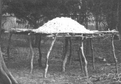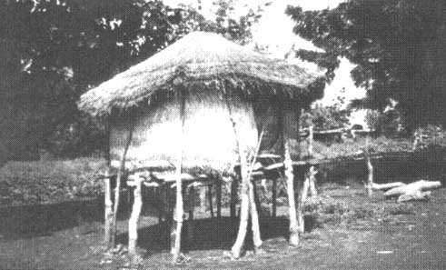 The construction of a traditional Kanbon (see Figure 10) consists of a cylindrical basket built on a wooden or stone platform or stand which is only slightly raised 0.2 m above the ground. The basket is made of grass mats (zanamats) and varies in size. The basket can be between 1 - 2 m high and 1.5 - 2.5 m in diameter. The traditional Kanbon is covered with a grass thatched lid which is normally removable and serves as an inlet and outlet for cassava chips. In many cases, a small grass door in the basket is used for the same purpose. The inside of a Kanbon can be plastered with a mud cover or cow dung. The cassava chips are loosely arranged in the basket. The life span of such a structure varies, according to farmers, from three to five years.