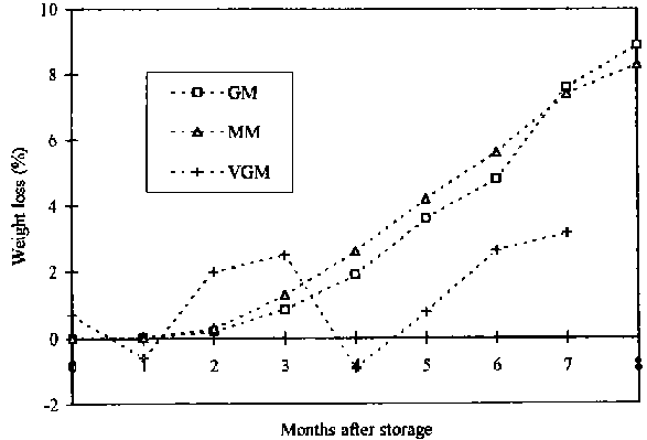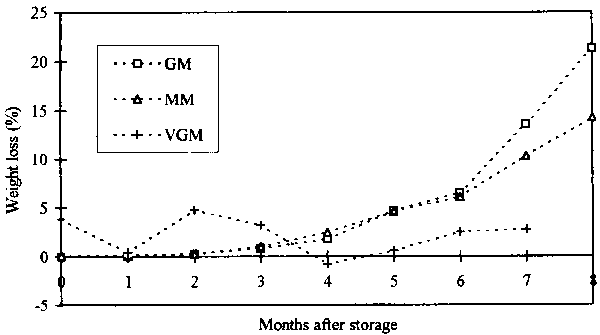 As in the trials under controlled conditions in Berlin, the weight losses assessed by the GM, MM and VGM increased with the length of storage period for both the farm and station studies. The MM loss curve correlated closely with the GM loss curve, whereas the VGM curve varied in comparison to the MM and GM for both studies (see Figures 33 and 34).