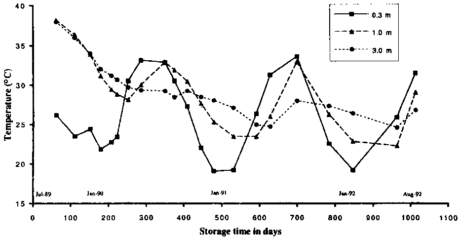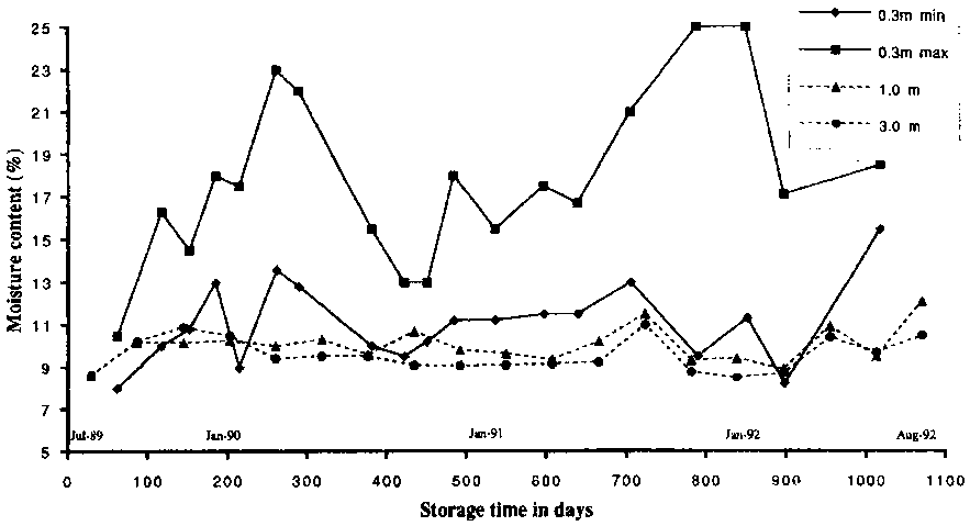 The average temperatures of grain at three different depths beneath the apex of the platform over the storage period are given in Fig. 3. This shows the very marked influence of seasonal temperature fluctuations in the ambient on temperatures at 0.3 m within the grain bulk, whereas at 1.0 and 3.0 m fluctuations were progressively attenuated. This resulted in the establishment of strong temperature gradients within the bulk particularly between 64 and 200 days of storage (November 1989-March 1990), around 500 days (January-February 1991) and around 850 days (January-February 1992). These temperature gradients were considered responsible for convection currents that caused moisture transfer to the peak area of the bulk.