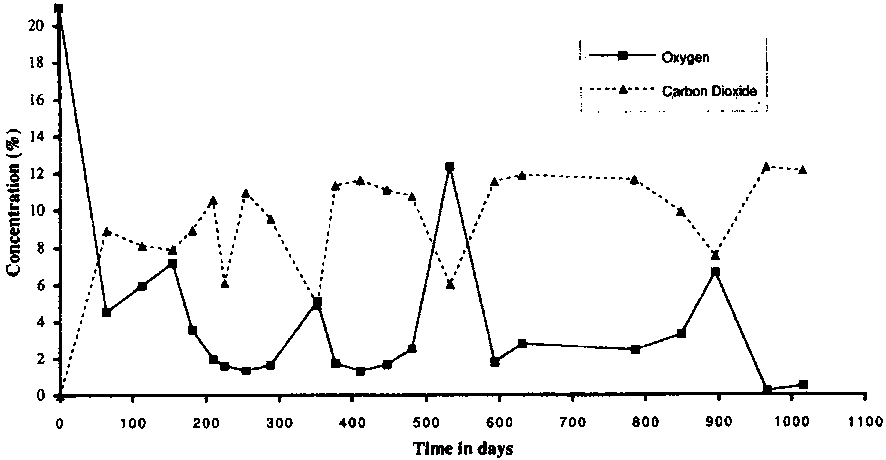 The CO2 and O2 concentrations of the intergranular air within the platform are given in Fig. 5. It can be seen that there was a rapid decrease in O2 and increase in CO2 concentration over the first 50 days followed by fairly stable levels for the rest of the storage period except for a sudden increase in O2 and decrease in CO2 after 540 and 900 days of storage. On these two occasions it was found that one or more of the plastic screw-caps were absent and the changes in gas composition were attributed to a temporary break in the hermetic seal of the platform. From experience on hermetic storage in Israel it has been found that in contrast to insect infestations, active microbial spoilage can raise CO2 readings well above 12%. Since very few CO2 recordings were made above this level during the storage period, this indicates that no extensive microbial respiration took place in the grain bulk.