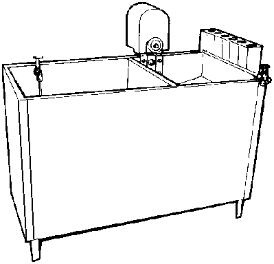 This is a two-headed bottle washing machine driven by a 0.19kW (0.25hp) single-phase motor. It is supplied with four nylon brushes (two are spare) for washing inside bottles. A large brush is also provided for cleaning exteriors. Inside and outside are washed simultaneously. There are two tanks; one for hot water and one for cold.