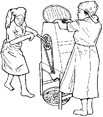 A rice dryer, based on an IRRI design, uses a 3hp (2.2kW) petrol engine or a 1.5kW (2hp) motor to drive a 47cm diameter vane-axial type fan and to supplement heating. Primary heat is provided by a rice-hull furnace or kerosene burner. There is an automatic safety burner shut-off mechanism. The weight (without engine) of the burner and fan is 40kg. Airflow is 1800 cfm at 2200 rpm, with a static pressure of 20mm water. Temperature: 43°C. Fuel consumption: 0.75 litres per hour petrol + 2.0 litres per hour kerosene or 3.4kg/h rice-hull. Drying bin dimensions: Length 277cm, width 190cm, height 92cm. Drying rate 23% moisture (w.b.) paddy (1 tonne) to 14% in 5-6 hours.