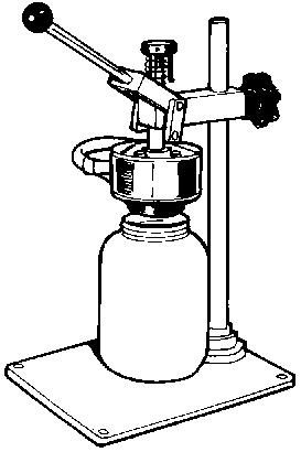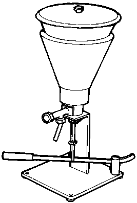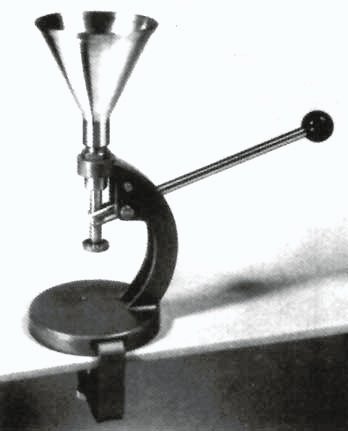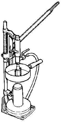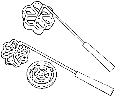 This is a hand-operated piston-type extruder for dough-like materials, and is available in many variations in Asia. It can be fabricated from metal or wood, with either a fixed or interchangeable die plate. Dimensions: 8 x 25 x 7cm.
