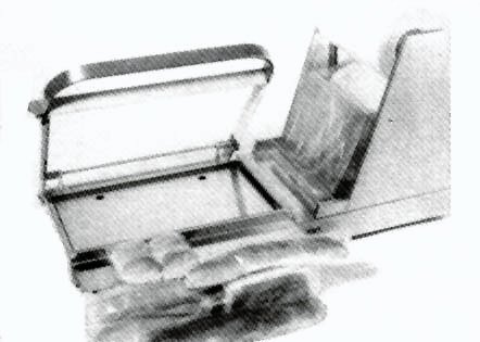 Ravioli can be made easily using this machine in the following way. Two rolled out sheets of dough, each 8.5cm wide, leave the pasta machine to feed the ravioli maker. A container for holding the stuffing is provided. The stuffing is placed manually onto the dough and covered. The process is continuous until the kneaded mixture in the hopper is exhausted. Throughput: 20kg per hour.