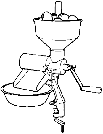 Fruit is positioned on a central pivot. As the handle is turned the fruit is revolved over a stationary knife and the peel is removed.
