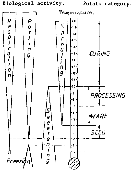 Temperature influences the rate of respiration of the tubers, sprout growth and the development of microorganisms causing rotting (see sections 2.2 and 2.2.3). Figure 4.8 indicates in simple way the relationship between storage temperature and biological activity, For example, at a storage temperature of 10°C, the rates of sprouting, rotting and respiration are modest, at 20°C these activities are almost at a maximum.