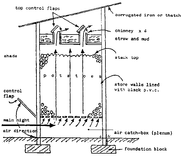 The principle of naturally convected air ventilation was applied to the storage of potatoes in warehouses of 7-20 tonne capacity. The structures were built of mudblock walls with a galvanised corrugated sheet steel roof. Controllable ventilation louvres, each 70cm x 30cm, were built into the two long walls, those at the windward side were 50 cm above the ground, those on the opposite wall were built at about 30 cm below the eaves level. There was at least one pair of louvres (inlet and outlet) for every three linear metres of wall. A ceiling of bamboo or raffia was built under the roof on which was placed a 30 cm thick layer of packed straw to insulate the building from the heat radiated from the metal roof. Mudblocks were preferred to cement blocks because their insulation was greater. The ventilation louvres were opened only at night. The average internal store temperature was 14.5ºC with a mean minimum outside air temperature (at night) of 10ºC and a mean maximum outside air temperature of 30ºC (Toet, 1982).