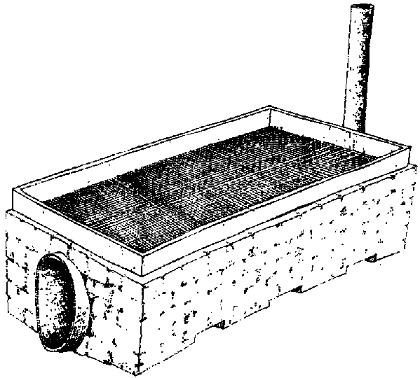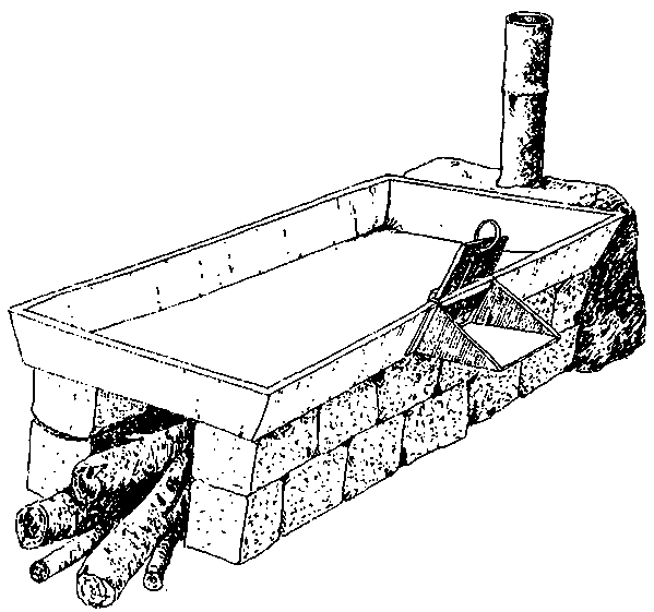 The FAO post-harvest project in Cameroon introduced improved fireplaces for the frying operation (Figure 5.9) consisting of an elongated fireplace built of burnt-clay bricks and with a three metres high chimney at one end to remove smoke and fumes from the fire. The traditional cast iron pans for frying are set into the top of the fire place. The improved fireplace are said to reduce wood consumption by 55% and the frying time by about half.