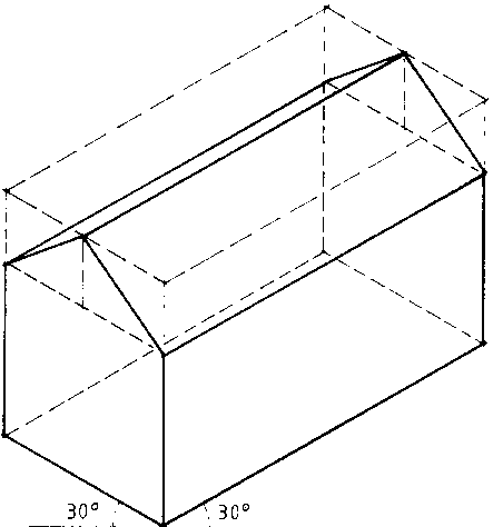 With isometric projection, horizontal lines of both front view and side view of the building are drawn to 30° from the horizontal using dimensions to scale. Vertical lines remain vertical and the same scale is used. Curved and slanted lines are developed by working within lightly sketched squares or rectangles, which are erased after use.