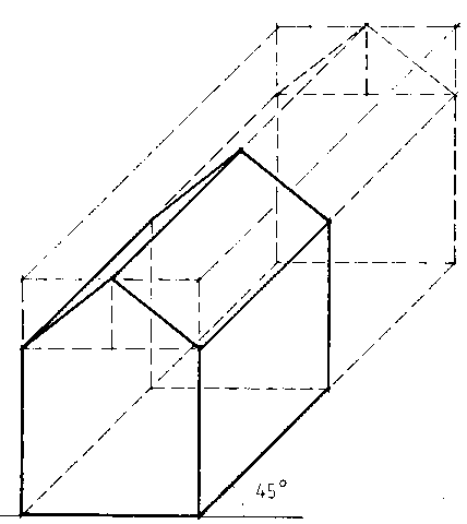 In axonometric projection the plan view of the building is placed on the drawing table with its side inclined from the horizontal at any angle. Usually 30°, 45° or 60° is chosen since those are the angles of the set squares. All vertical lines of the building remain vertical and are drawn to the scale of the plan view.