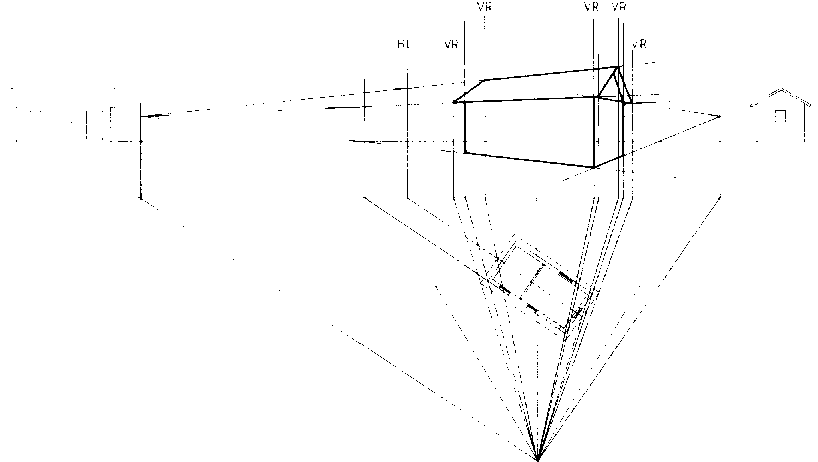 The picture plane is a line drawn at 90° to the centre of vision line i.e., horizontal on the drawing board. The distance between the station point and the picture plane will directly influence the size of the perspective picture. Think again of the situation where the outline of a building was traced on a window pane. If the window pane was moved closer, the outline picture would be smaller. Thus, if the reader of a perspective drawing is to get an image of the true size of the illustrated building, he will have to look at the perspective from the same distance as the distance between the station point and the picture plane when it was constructed. Therefore this distance is normally taken to be 400 to 600mm. The vanishing points are then located by drawing lines from the station point to the picture plane parallel to the visual sides of the building.