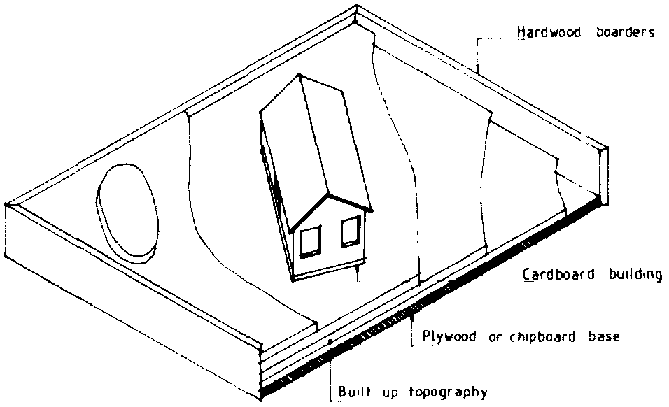 Models can be increased in strength and rigidity by bracing the walls with square pieces of cardboard in positions where they will not show in the finished model. Bracing is particularly important in models which are going to be painted as paint will tend to warp cardboard and sheet wood if applied over large areas. Regardless of the material being represented, colours should be subdued and have a flat, not glossy, finish. Distemper or water colour is best for use on cardboard and unsealed wood, but care must be taken to remove excess glue as this will seal the surface and cause the colour to peel off.