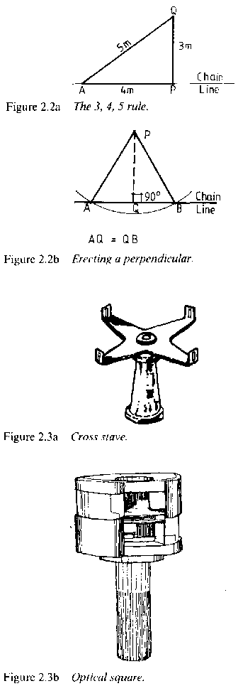 Two simple instruments for setting out right angles are the cross stave and the optical square (Figure 2.3). Either one is mounted at eye level on a range rod at the corner where the angle is to be set out. In either case the instrument is turned carefully until one line of the right angle can be sighted. Then the second line can be swung slightly until it can also be sighted.